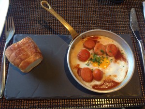 มานี้ไข่กระทะเฮ้ย Egg & Sausage Stewed จานนี้พี่หมีว่าเด่นสุดในเมนูไข่ครับ ตัวมะเขือเทศรสดีมากพอมาทานคู่กับไช่และไส้กรอกฟินมากครับ มาพร้อม บาแก็ต ที่มีเนยกระเทียม นี่ฟินมากครับ บาแก็ตถ้าทานตอนอุ่นๆ เนี่ยเป็นไรที่ฟินมากครับ เปลือกจะกรอบเหนียว เนื้อขนมปังจะนุ่มมว๊ากกกกกกก ชอบครับจานนี้อยากเบิ้ล T T